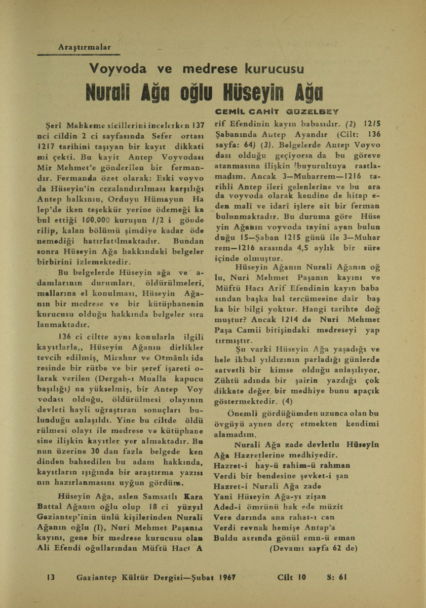Şerî Mahkeme sicillerini incelerken 137’nci cildin 2’nci sayfasında Sefer ortası 1217 tarihini taşıyan bir kayıt dikkatimi çekti. Bu kayıt Antep Voyvodası Mir Mehmet'e gönderilen bir fermandır. Fermanda özet olarak: Eski voyvoda Hüseyin’in cezalandırılması karşılığı Antep halkının, Orduyu Hümayun Halep’de iken teşekkür yerine ödemeği kabul ettiği 100.000 kuruşun 1/2 i gönderilip, kalan bölümü şimdiye kadar ödenemediği hatırlatılmaktadır. Bundan sonra Hüseyin Ağa hakkındaki belgeler birbirini izlemektedir.