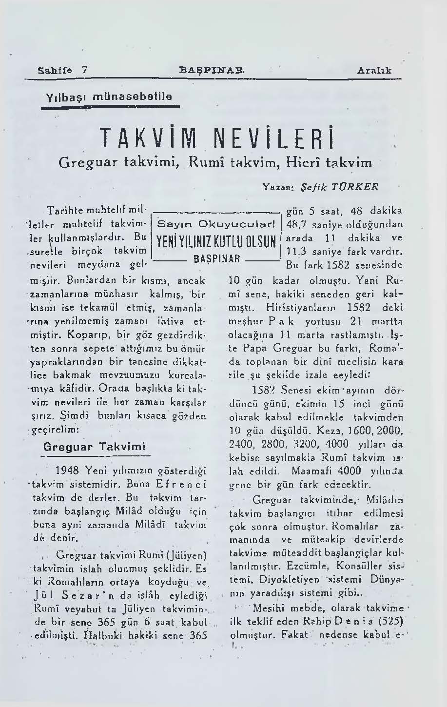 1582 senesi ekim ayının dördüncü günü, ekimin 15 inci günü olarak kabul edilmişti. Halbuki hakiki sene 365 gün 5 saat, 48 dakika 48,7 saniye olduğundan arada 11 dakika ve 11.3 saniye fark vardır. Bu fark 1582 senesinde 10 gün kadar olmuştu. Yani Rumî sene, hakiki seneden geri kalmıştı. Hristiyanların 1582 deki meşhur Pak yortusu 21 martta olacağına 11 marta rastlamıştı. İşte Papa Greguar bu farkı, Roma’da toplanan bir dinî meclisin kararile şu şekilde izale eyledi: