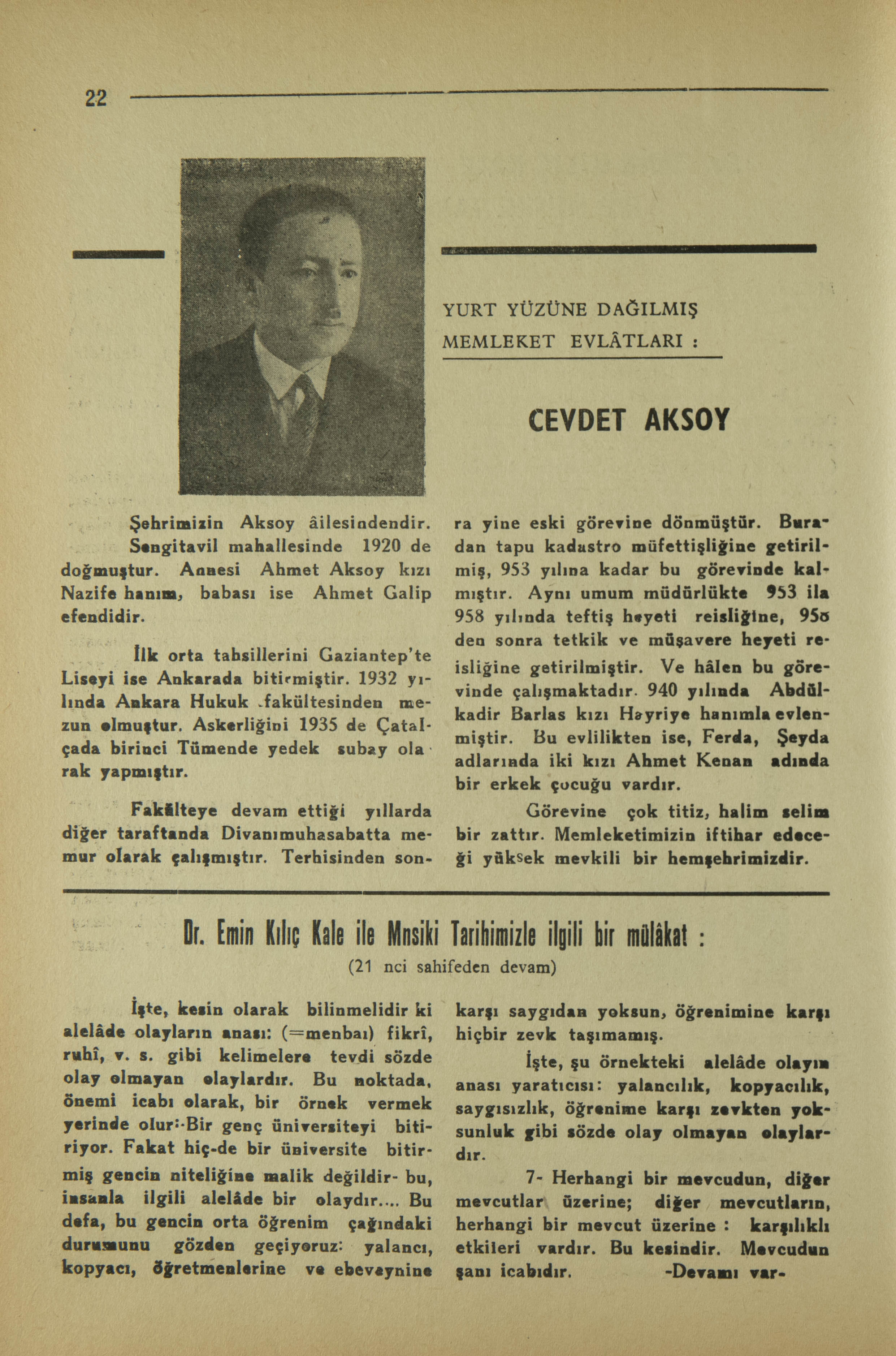 Şehrimizin Aksoy ailesindendir. Sengitavil Mahallesi'nde 1920'de doğmuştur. Annesi Ahmet Aksoy, kızı Nazife Hanım, babası ise Ahmet Galip Efendi'dir.