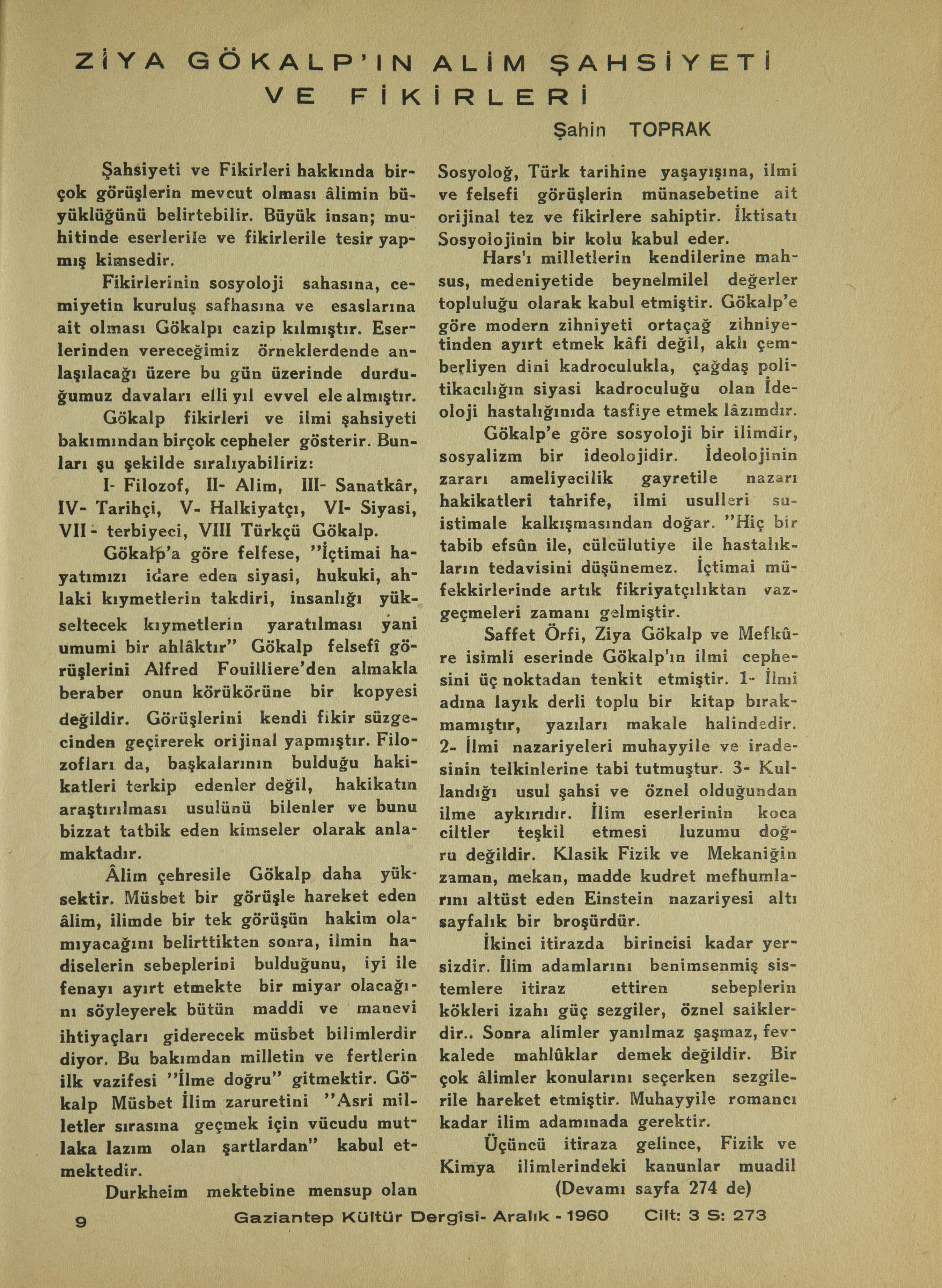 Durkheim mektebine mensup olan Sosyoloğ, Türk tarihine yaşayışına, ilmi ve felsefi görüşlerin münasebetine ait orijinal tez ve fikirlere sahiptir. İktisatı Sosyolojinin bir kolu kabul eder.